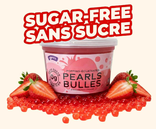 Points forts : sans sucre ajouté, saveurs fraise et mangue, texture éclatante en bouche, parfaites pour bubble tea, slush et limonades, produit québécois et sans sucre.